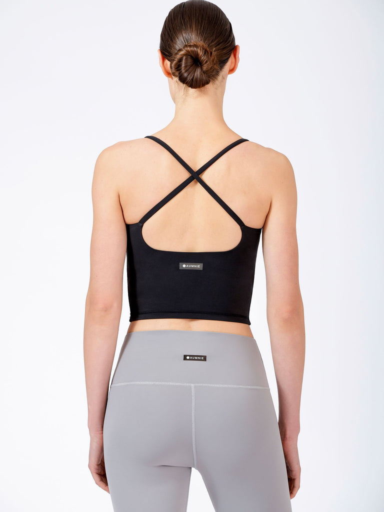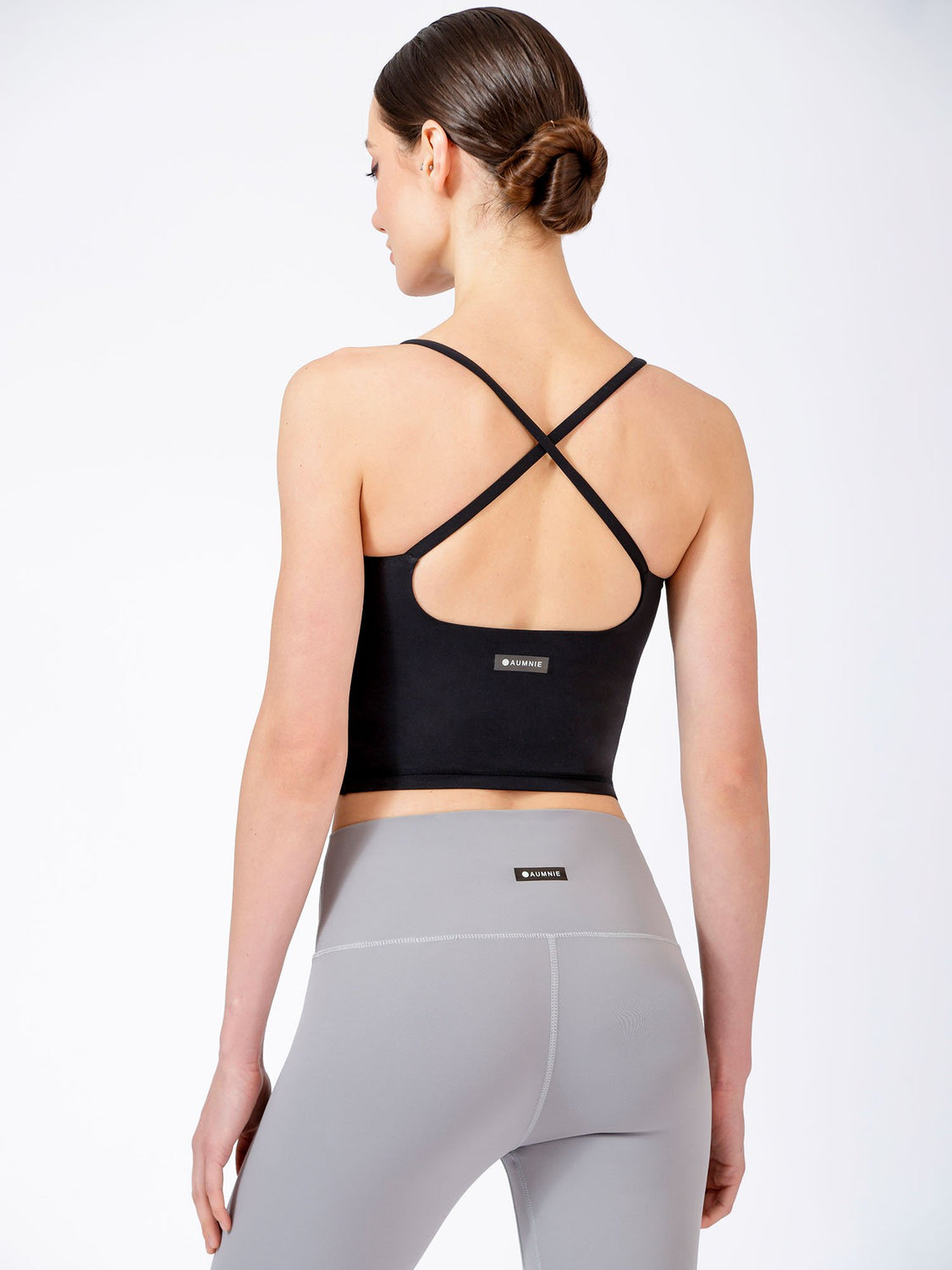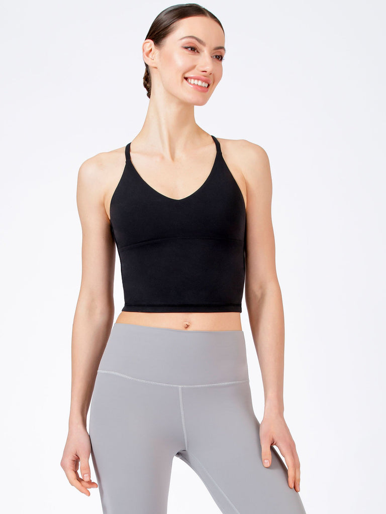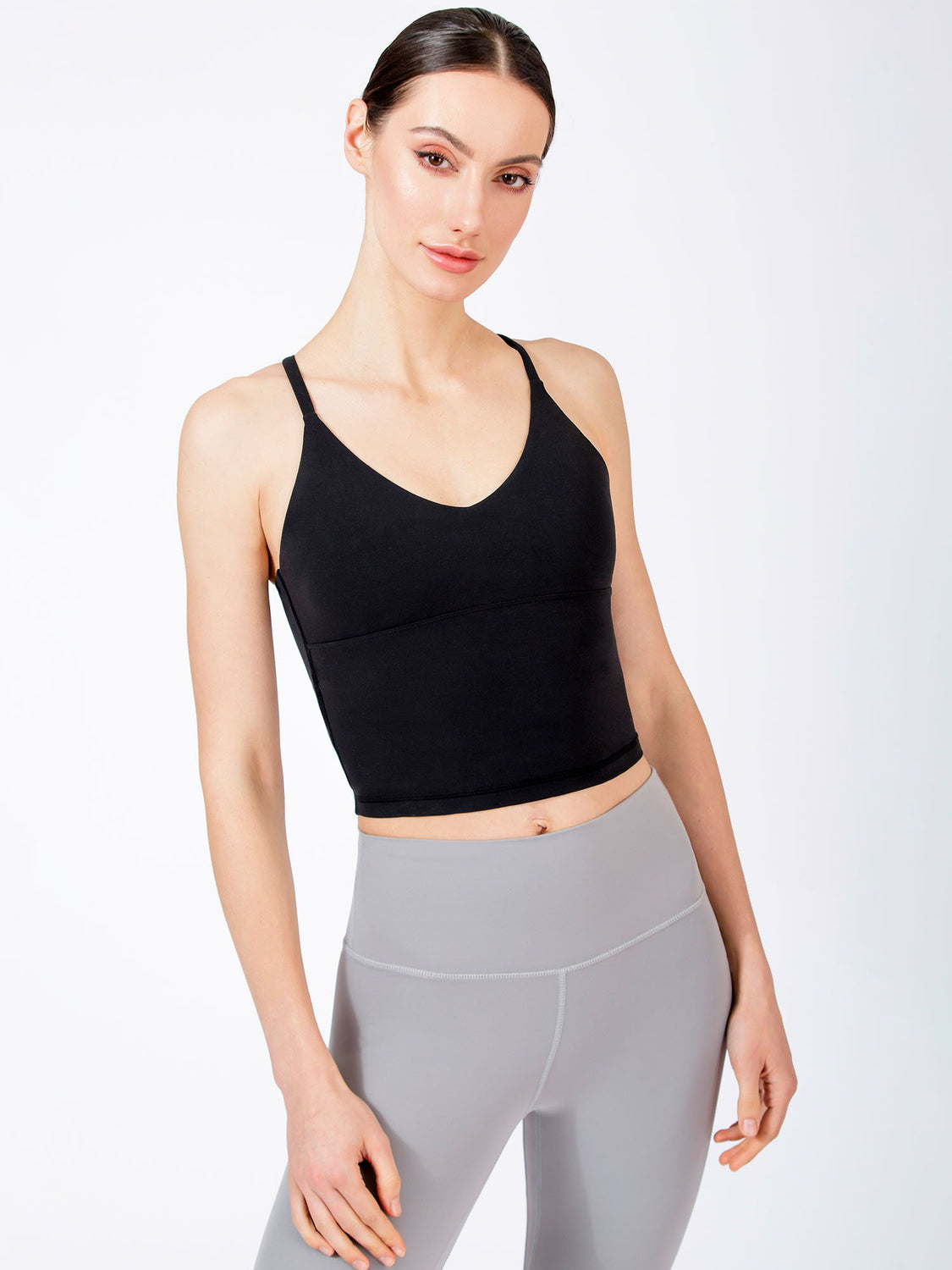 肩紐を気にせず動きに集中できるバッククロスストラップ。デコルテ美しく見せてくれるVネックデザイン。